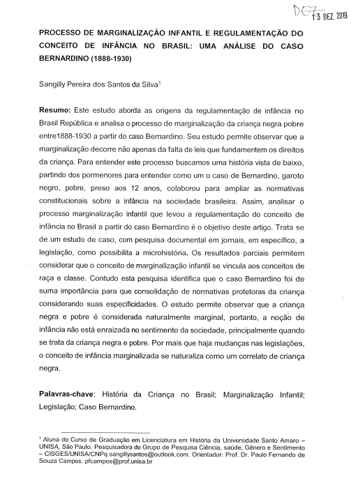 SILVA, Sangilly Pereira dos Santos. Processo de marginalização infantil e regulamentação do conceito de infância no brasil: uma análise do caso Bernardino (1888-1930). Trabalho de Conclusão de Curso (Licenciatura em História) - Universidade Santo Amaro, São Paulo, 2019.